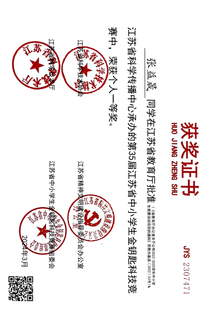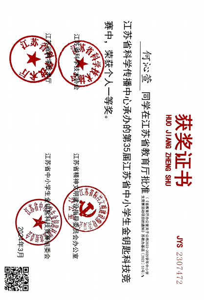 我校六(5)班张益晟、四(3)班何沁萱两位学生双双获得第35届江苏省中小学金钥匙科技竞赛一等奖,这个奖项是省级的,非常难得,让我一起为他们的努力和成绩鼓掌!!!